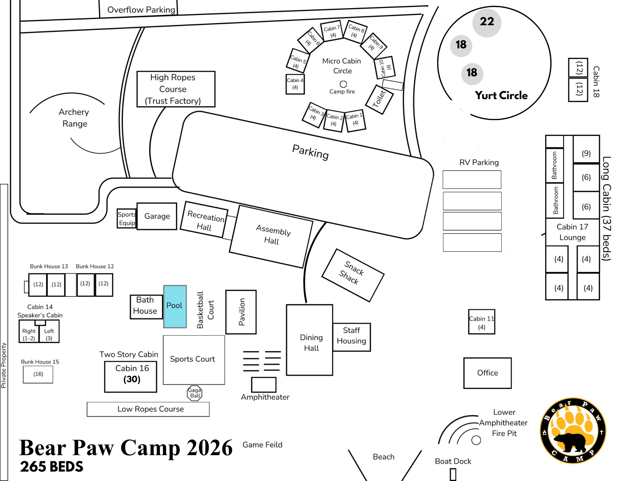 Bear Paw currently offers 200+ beds dispersed between lodges and micro-cabins, 8 RV sites, a full commercial kitchen, dinning facilities, meeting hall, game area and snack bar. Outdoor activities include athletic field, volleyball courts, high and low ropes courses, swimming pool, 750 feet of waterfront on the Pend Oreille River, boating, fishing, archery, basketball, and covered pavilion.